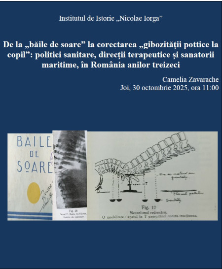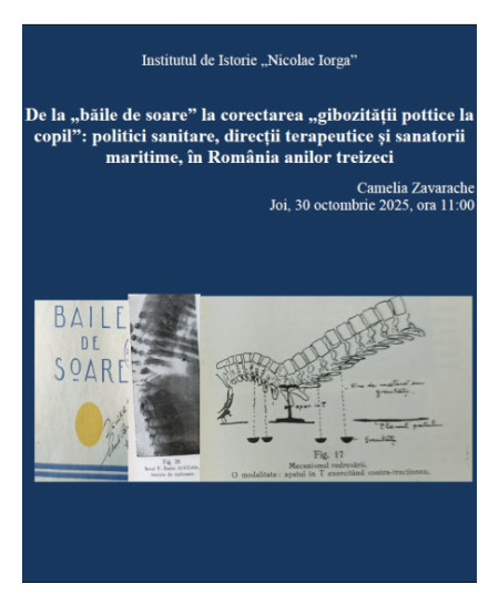 Institutul de Istorie „N. Iorga” al Academiei Române (Programul IV)  vă invită joi, 30 octombrie 2025, de la ora 11 la comunicarea susținută de doamna Camelia Zavarache intitulată De la „băile de soare” la corectarea „gibozității pottice la copil”: politici sanitare, direcții terapeutice și sanatorii maritime, în România anilor treizeci