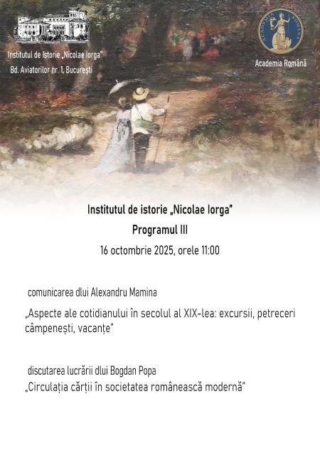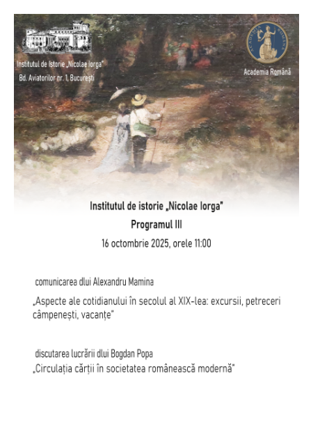 Programul III „Europa şi românii în secolul al XIX-lea şi la începutul secolului al XX-lea” vă invită, joi, 16 octombrie 2025, orele 11.00 la audierea conferinţei prezentată de dr. Alexandru Mamina „Aspecte ale cotidianului în secolul al XIX-lea: excursii, petreceri câmpeneşti, vacanţe”, urmată de discuţii asupra lucrării dr. Bogdan Popa „Circulaţia cărţii în societatea românească modernă”