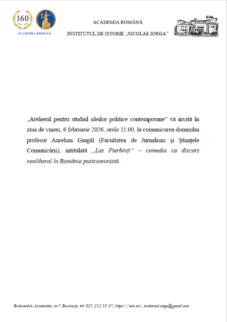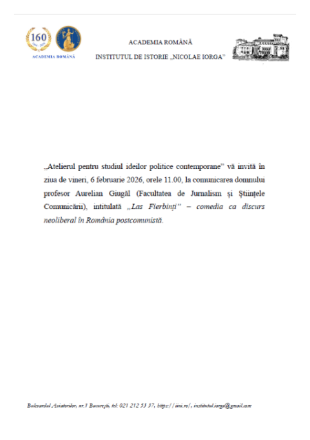 „Atelierul pentru studiul ideilor politice contemporane” vă invită în ziua de vineri, 6 februarie 2026, orele 11.00, la comunicarea domnului profesor Aurelian Giugăl (Facultatea de Jurnalism și Științele Comunicării), intitulată „Las Fierbinți” – comedia ca discurs neoliberal în România postcomunistă.