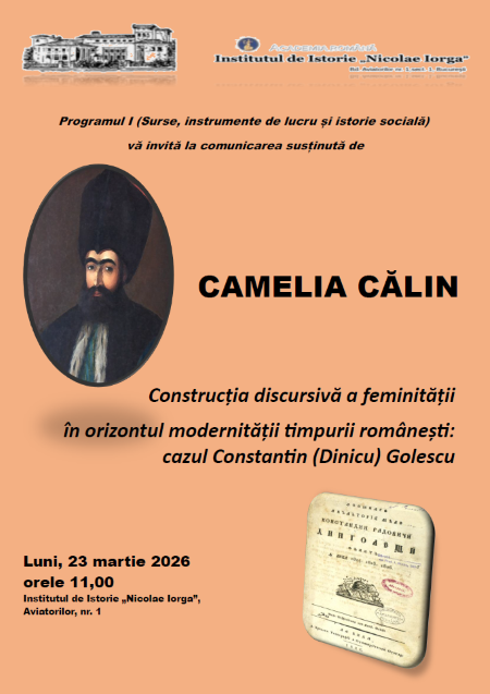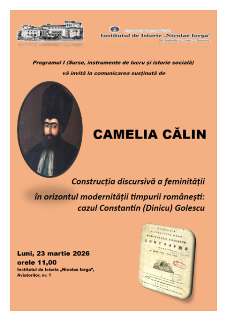 Programul I, Surse, instrumente de lucru și istorie socială, vă invită luni, 23 martie 2026, orele 11:00, la comunicarea susținută de Camelia Călin, Construcția discursivă a feminității în orizontul modernității timpurii românești: cazul Constantin (Dinicu) Golescu.