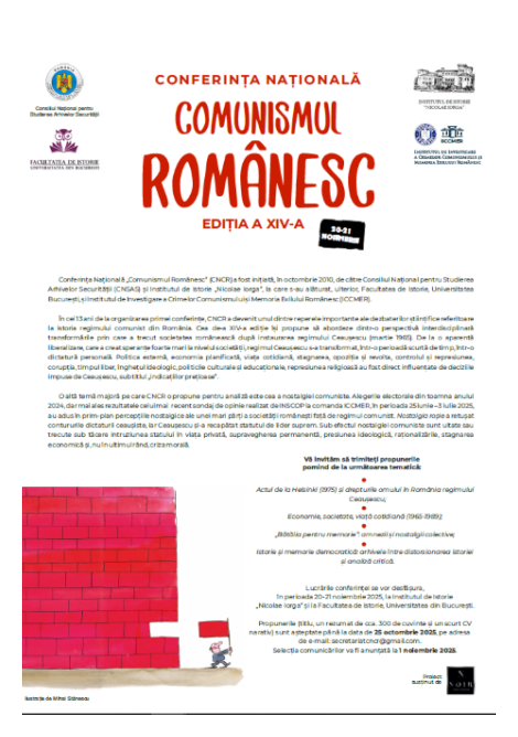 Institutul de Istorie „N. Iorga” în parteneriat cu Consilul Național pentru Studierea Arhivelor fostei Securități (CNSAS), Facultatea de Istorie, Universitatea București și Institutul pentru Investigarea Crimelor Comunismului și Memoria Exilului Românesc (ICCMER) vă invită să trimiteți propuneri pentru cea de-a XIV-a ediție a Conferinței Naționale „Comunismul Românesc”, care se va desfășura între 20 și 21 noiembrie.